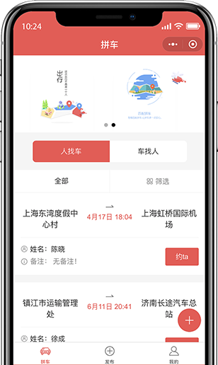 拼車模塊分車找人和人找車兩種模式,進入小程序后用戶只需要輸入自己的具體位置和目的地,將信息進行提交后,小程序會將發布信息上傳至平臺,尋找相匹配的私家車或者乘客。